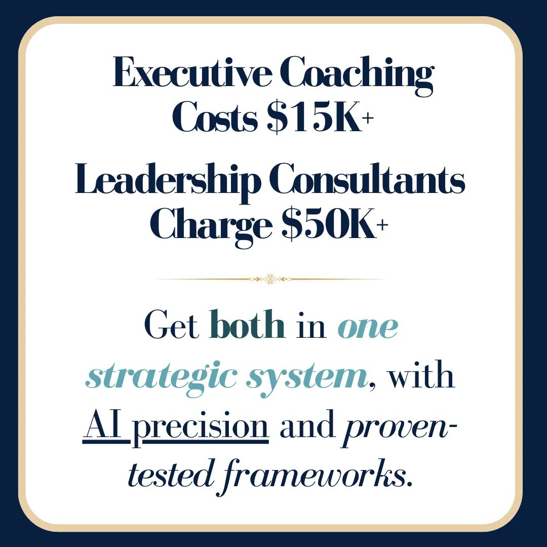 Traditional coaching costs $15K+ and requires scheduling around busy executive calendars. Our system gives you 24/7 access to proven frameworks that typically take months to develop.