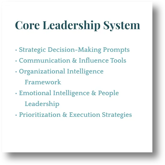 This is a strategic leadership system that happens to be AI-powered. The prompts are built from real executive challenges and proven frameworks, not generic AI responses.