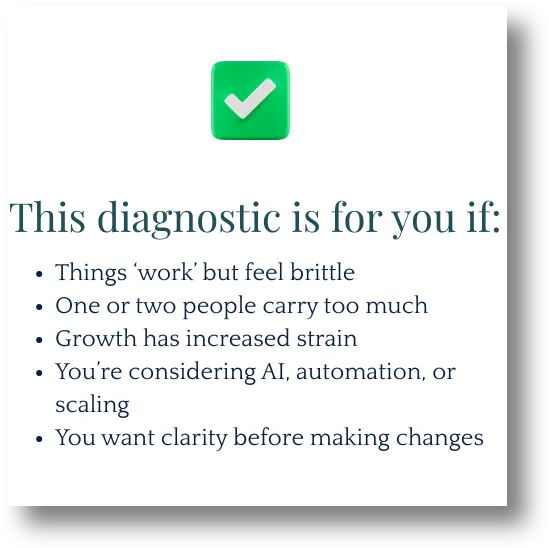 This diagnostic was created by a Systems Stabilizer who works with leaders and organizations whose systems technically work - but rely too heavily on people, memory, or constant compensation.